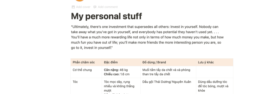 Ở personal stuff, mình nhận định việc quan sát, thấu hiểu cơ thể rất quan trọng. Mình ghi phần chăm sóc theo từng bộ phận bên trong lẫn bên ngoài, đây là một trang rất dài. Trang được liệt kê tất cả các bộ phận của mình. Từ tóc tới khối óc, từ cơ quan tiêu hóa tới thói quen đi vệ sinh, rồi tới tận bàn chân. Mình viết ra là chúng thường có đặc điểm gì, mình hay gặp vấn đề sức khỏe gì ở những bộ phận này, và mình đã học được là để chăm sóc hay hỗ trợ nó thì mình nên làm gì, mình nên sử dụng sản phẩm nào của nhãn hàng nào để chăm sóc, nuôi dưỡng nó.