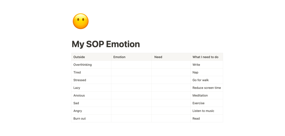 (1) My SOP Emotion – nơi mình định nghĩ từng cảm xúc và ghi nhận thói quen phản ứng của bản thân